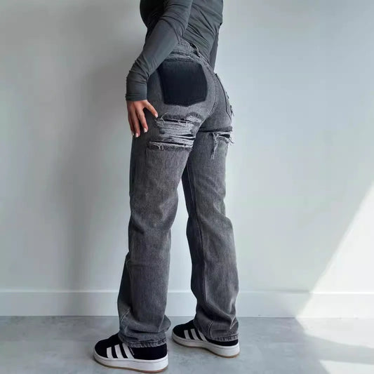 Ripped Black Zip-Up Jeans with Washed Ink Splatter